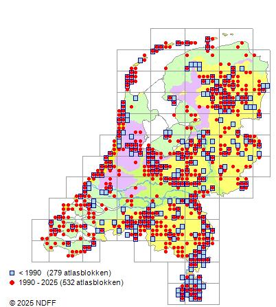 Het aantal atlasblokken (5x5 km) waarin de soort is gemeld binnen een periode van vijf jaar (vanaf 1980) of twintig jaar. Niet gecorrigeerd voor waarnemersinspanning en het aantal doorgegeven waarnemingen kan sterk variëren per periode, dus een trend in verspreiding kan hier niet direct uit worden afgelezen. Het opgegeven jaartal is het eerste jaar van de periode. Bron: gevalideerde waarnemingen uit de NDFF.
