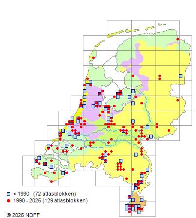 Het aantal atlasblokken (5x5 km) waarin de soort is gemeld binnen een periode van vijf jaar (vanaf 1980) of twintig jaar. Niet gecorrigeerd voor waarnemersinspanning en het aantal doorgegeven waarnemingen kan sterk variëren per periode, dus een trend in verspreiding kan hier niet direct uit worden afgelezen. Het opgegeven jaartal is het eerste jaar van de periode. Bron: gevalideerde waarnemingen uit de NDFF.