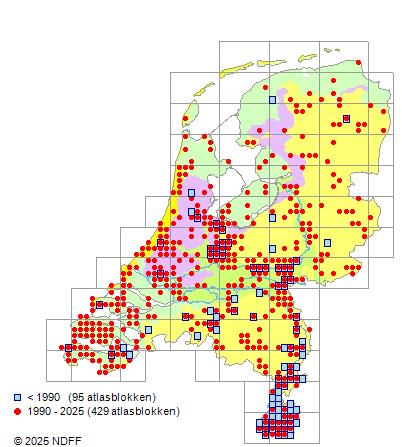 Het aantal atlasblokken (5x5 km) waarin de soort is gemeld binnen een periode van vijf jaar (vanaf 1980) of twintig jaar. Niet gecorrigeerd voor waarnemersinspanning en het aantal doorgegeven waarnemingen kan sterk variëren per periode, dus een trend in verspreiding kan hier niet direct uit worden afgelezen. Het opgegeven jaartal is het eerste jaar van de periode. Bron: gevalideerde waarnemingen uit de NDFF.