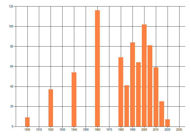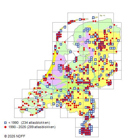 Het aantal atlasblokken (5x5 km) waarin de soort is gemeld binnen een periode van vijf jaar (vanaf 1980) of twintig jaar. Niet gecorrigeerd voor waarnemersinspanning en het aantal doorgegeven waarnemingen kan sterk variëren per periode, dus een trend in verspreiding kan hier niet direct uit worden afgelezen. Het opgegeven jaartal is het eerste jaar van de periode. Bron: gevalideerde waarnemingen uit de NDFF.