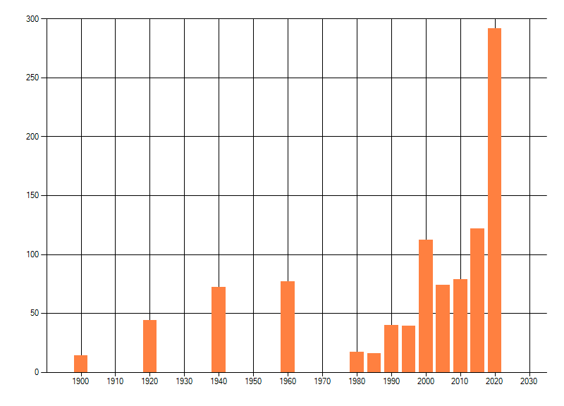 Het aantal atlasblokken (5x5 km) waarin de soort is gemeld binnen een periode van vijf jaar (vanaf 1980) of twintig jaar. Niet gecorrigeerd voor waarnemersinspanning en het aantal doorgegeven waarnemingen kan sterk variëren per periode, dus een trend in verspreiding kan hier niet direct uit worden afgelezen. Het opgegeven jaartal is het eerste jaar van de periode. Bron: gevalideerde waarnemingen uit de NDFF.