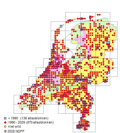 Het aantal atlasblokken (5x5 km) waarin de soort is gemeld binnen een periode van vijf jaar (vanaf 1980) of twintig jaar. Niet gecorrigeerd voor waarnemersinspanning en het aantal doorgegeven waarnemingen kan sterk variëren per periode, dus een trend in verspreiding kan hier niet direct uit worden afgelezen. Het opgegeven jaartal is het eerste jaar van de periode. Bron: gevalideerde waarnemingen uit de NDFF.
