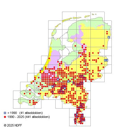 Het aantal atlasblokken (5x5 km) waarin de soort is gemeld binnen een periode van vijf jaar (vanaf 1980) of twintig jaar. Niet gecorrigeerd voor waarnemersinspanning en het aantal doorgegeven waarnemingen kan sterk variëren per periode, dus een trend in verspreiding kan hier niet direct uit worden afgelezen. Het opgegeven jaartal is het eerste jaar van de periode. Bron: gevalideerde waarnemingen uit de NDFF.
