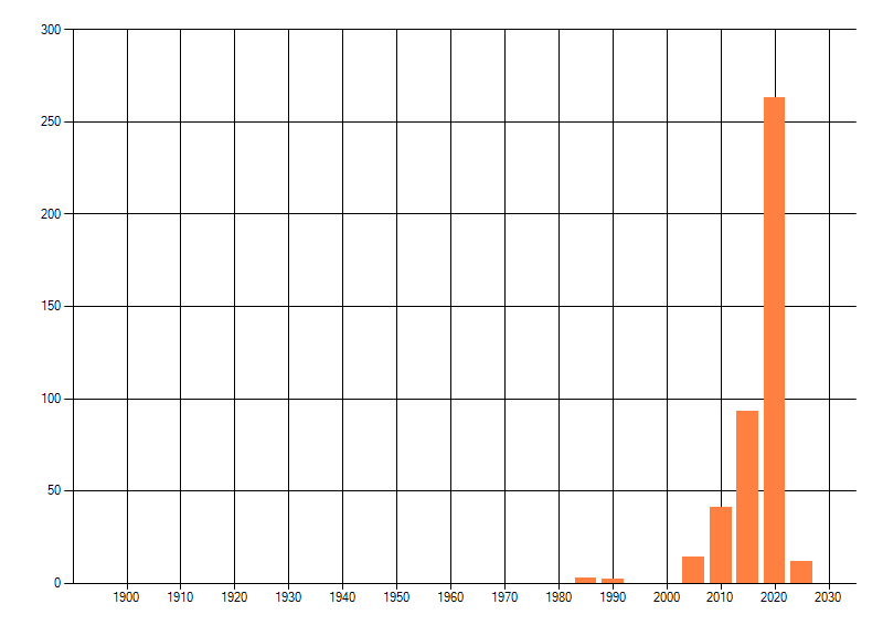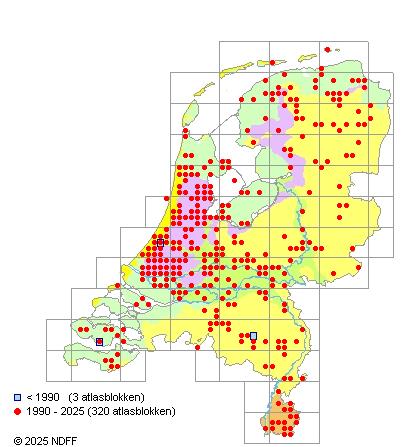 Het aantal atlasblokken (5x5 km) waarin de soort is gemeld binnen een periode van vijf jaar (vanaf 1980) of twintig jaar. Niet gecorrigeerd voor waarnemersinspanning en het aantal doorgegeven waarnemingen kan sterk variëren per periode, dus een trend in verspreiding kan hier niet direct uit worden afgelezen. Het opgegeven jaartal is het eerste jaar van de periode. Bron: gevalideerde waarnemingen uit de NDFF.