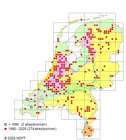 Het aantal atlasblokken (5x5 km) waarin de soort is gemeld binnen een periode van vijf jaar (vanaf 1980) of twintig jaar. Niet gecorrigeerd voor waarnemersinspanning en het aantal doorgegeven waarnemingen kan sterk variëren per periode, dus een trend in verspreiding kan hier niet direct uit worden afgelezen. Het opgegeven jaartal is het eerste jaar van de periode. Bron: gevalideerde waarnemingen uit de NDFF.