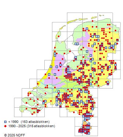 Het aantal atlasblokken (5x5 km) waarin de soort is gemeld binnen een periode van vijf jaar (vanaf 1980) of twintig jaar. Niet gecorrigeerd voor waarnemersinspanning en het aantal doorgegeven waarnemingen kan sterk variëren per periode, dus een trend in verspreiding kan hier niet direct uit worden afgelezen. Het opgegeven jaartal is het eerste jaar van de periode. Bron: gevalideerde waarnemingen uit de NDFF.
