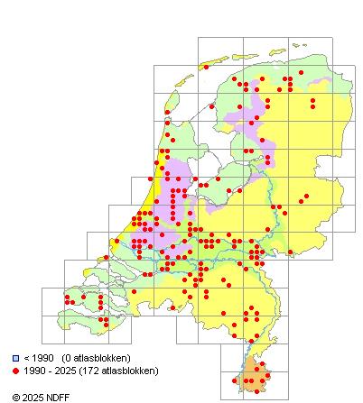 Het aantal atlasblokken (5x5 km) waarin de soort is gemeld binnen een periode van vijf jaar (vanaf 1980) of twintig jaar. Niet gecorrigeerd voor waarnemersinspanning en het aantal doorgegeven waarnemingen kan sterk variëren per periode, dus een trend in verspreiding kan hier niet direct uit worden afgelezen. Het opgegeven jaartal is het eerste jaar van de periode. Bron: gevalideerde waarnemingen uit de NDFF.