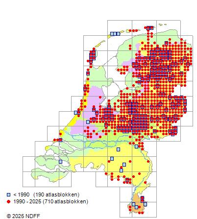 Het aantal atlasblokken (5x5 km) waarin de soort is gemeld binnen een periode van vijf jaar (vanaf 1980) of twintig jaar. Niet gecorrigeerd voor waarnemersinspanning en het aantal doorgegeven waarnemingen kan sterk variëren per periode, dus een trend in verspreiding kan hier niet direct uit worden afgelezen. Het opgegeven jaartal is het eerste jaar van de periode. Bron: gevalideerde waarnemingen uit de NDFF.