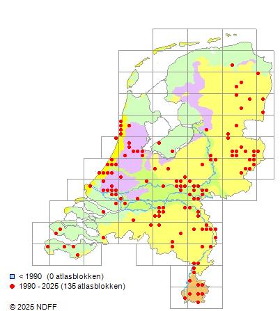 Het aantal atlasblokken (5x5 km) waarin de soort is gemeld binnen een periode van vijf jaar (vanaf 1980) of twintig jaar. Niet gecorrigeerd voor waarnemersinspanning en het aantal doorgegeven waarnemingen kan sterk variëren per periode, dus een trend in verspreiding kan hier niet direct uit worden afgelezen. Het opgegeven jaartal is het eerste jaar van de periode. Bron: gevalideerde waarnemingen uit de NDFF.