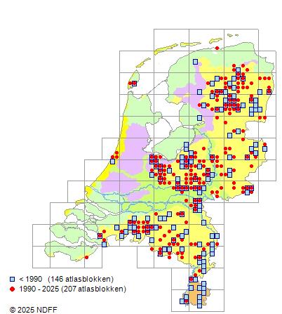 Het aantal atlasblokken (5x5 km) waarin de soort is gemeld binnen een periode van vijf jaar (vanaf 1980) of twintig jaar. Niet gecorrigeerd voor waarnemersinspanning en het aantal doorgegeven waarnemingen kan sterk variëren per periode, dus een trend in verspreiding kan hier niet direct uit worden afgelezen. Het opgegeven jaartal is het eerste jaar van de periode. Bron: gevalideerde waarnemingen uit de NDFF.