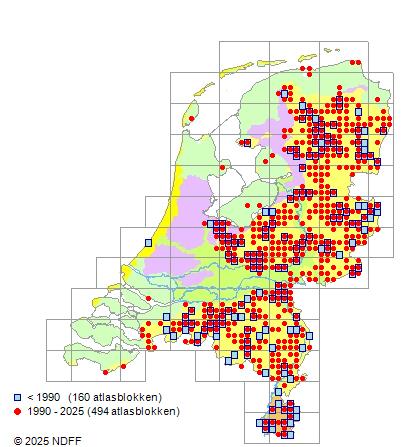 Het aantal atlasblokken (5x5 km) waarin de soort is gemeld binnen een periode van vijf jaar (vanaf 1980) of twintig jaar. Niet gecorrigeerd voor waarnemersinspanning en het aantal doorgegeven waarnemingen kan sterk variëren per periode, dus een trend in verspreiding kan hier niet direct uit worden afgelezen. Het opgegeven jaartal is het eerste jaar van de periode. Bron: gevalideerde waarnemingen uit de NDFF.
