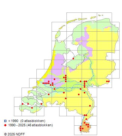 Het aantal atlasblokken (5x5 km) waarin de soort is gemeld binnen een periode van vijf jaar (vanaf 1980) of twintig jaar. Niet gecorrigeerd voor waarnemersinspanning en het aantal doorgegeven waarnemingen kan sterk variëren per periode, dus een trend in verspreiding kan hier niet direct uit worden afgelezen. Het opgegeven jaartal is het eerste jaar van de periode. Bron: gevalideerde waarnemingen uit de NDFF.