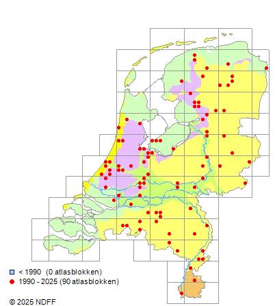 Het aantal atlasblokken (5x5 km) waarin de soort is gemeld binnen een periode van vijf jaar (vanaf 1980) of twintig jaar. Niet gecorrigeerd voor waarnemersinspanning en het aantal doorgegeven waarnemingen kan sterk variëren per periode, dus een trend in verspreiding kan hier niet direct uit worden afgelezen. Het opgegeven jaartal is het eerste jaar van de periode. Bron: gevalideerde waarnemingen uit de NDFF.