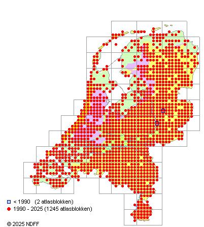Het aantal atlasblokken (5x5 km) waarin de soort is gemeld binnen een periode van vijf jaar (vanaf 1980) of twintig jaar. Niet gecorrigeerd voor waarnemersinspanning en het aantal doorgegeven waarnemingen kan sterk variëren per periode, dus een trend in verspreiding kan hier niet direct uit worden afgelezen. Het opgegeven jaartal is het eerste jaar van de periode. Bron: gevalideerde waarnemingen uit de NDFF.
