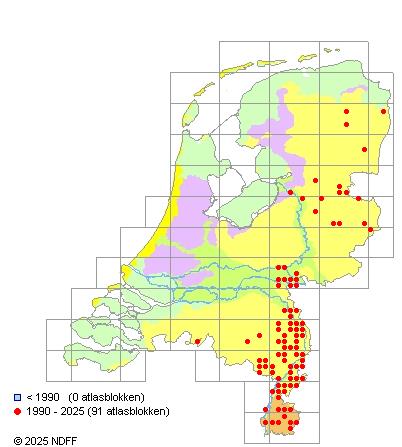 Het aantal atlasblokken (5x5 km) waarin de soort is gemeld binnen een periode van vijf jaar (vanaf 1980) of twintig jaar. Niet gecorrigeerd voor waarnemersinspanning en het aantal doorgegeven waarnemingen kan sterk variëren per periode, dus een trend in verspreiding kan hier niet direct uit worden afgelezen. Het opgegeven jaartal is het eerste jaar van de periode. Bron: gevalideerde waarnemingen uit de NDFF.