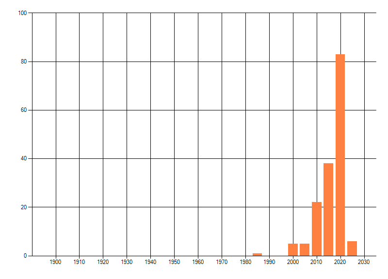 Het aantal atlasblokken (5x5 km) waarin de soort is gemeld binnen een periode van vijf jaar (vanaf 1980) of twintig jaar. Niet gecorrigeerd voor waarnemersinspanning en het aantal doorgegeven waarnemingen kan sterk variëren per periode, dus een trend in verspreiding kan hier niet direct uit worden afgelezen. Het opgegeven jaartal is het eerste jaar van de periode. Bron: gevalideerde waarnemingen uit de NDFF.