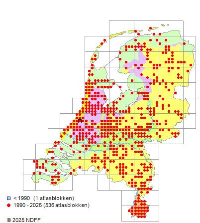 Het aantal atlasblokken (5x5 km) waarin de soort is gemeld binnen een periode van vijf jaar (vanaf 1980) of twintig jaar. Niet gecorrigeerd voor waarnemersinspanning en het aantal doorgegeven waarnemingen kan sterk variëren per periode, dus een trend in verspreiding kan hier niet direct uit worden afgelezen. Het opgegeven jaartal is het eerste jaar van de periode. Bron: gevalideerde waarnemingen uit de NDFF.