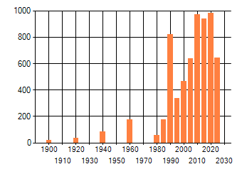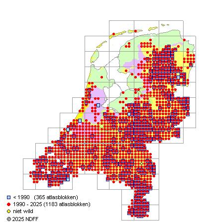 Het aantal atlasblokken (5x5 km) waarin de soort is gemeld binnen een periode van vijf jaar (vanaf 1980) of twintig jaar. Niet gecorrigeerd voor waarnemersinspanning en het aantal doorgegeven waarnemingen kan sterk variëren per periode, dus een trend in verspreiding kan hier niet direct uit worden afgelezen. Het opgegeven jaartal is het eerste jaar van de periode. Bron: gevalideerde waarnemingen uit de NDFF.