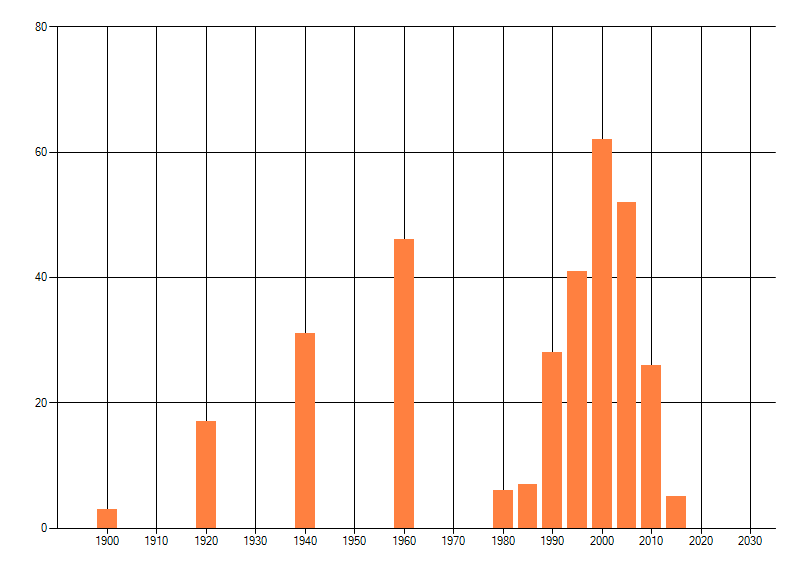 Het aantal atlasblokken (5x5 km) waarin de soort is gemeld binnen een periode van vijf jaar (vanaf 1980) of twintig jaar. Niet gecorrigeerd voor waarnemersinspanning en het aantal doorgegeven waarnemingen kan sterk variëren per periode, dus een trend in verspreiding kan hier niet direct uit worden afgelezen. Het opgegeven jaartal is het eerste jaar van de periode. Bron: gevalideerde waarnemingen uit de NDFF.