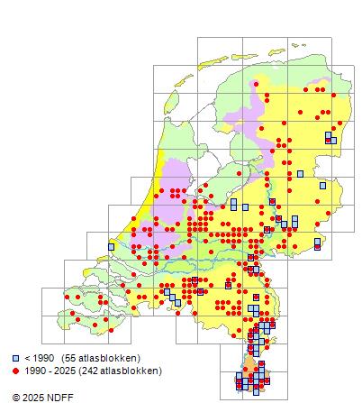 Het aantal atlasblokken (5x5 km) waarin de soort is gemeld binnen een periode van vijf jaar (vanaf 1980) of twintig jaar. Niet gecorrigeerd voor waarnemersinspanning en het aantal doorgegeven waarnemingen kan sterk variëren per periode, dus een trend in verspreiding kan hier niet direct uit worden afgelezen. Het opgegeven jaartal is het eerste jaar van de periode. Bron: gevalideerde waarnemingen uit de NDFF.