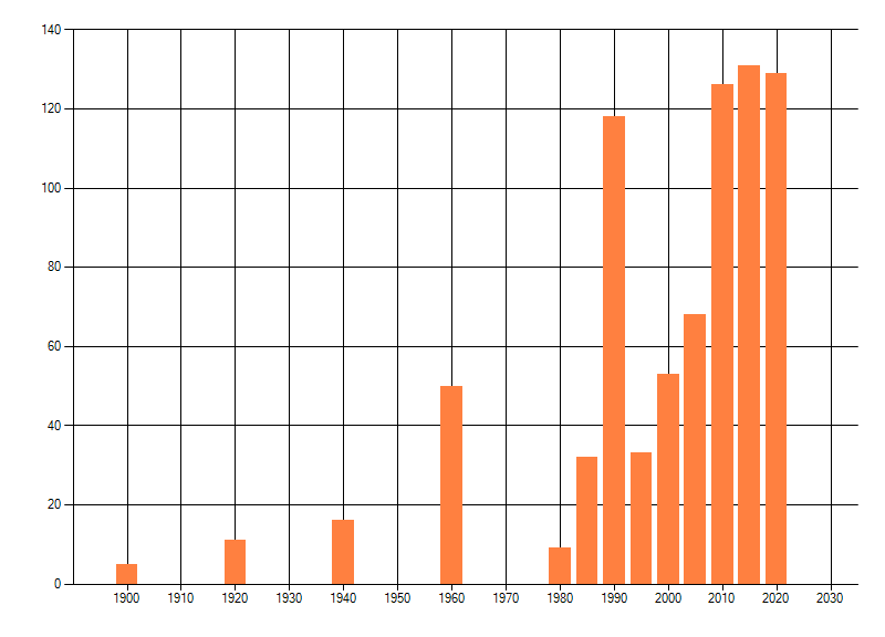 Het aantal atlasblokken (5x5 km) waarin de soort is gemeld binnen een periode van vijf jaar (vanaf 1980) of twintig jaar. Niet gecorrigeerd voor waarnemersinspanning en het aantal doorgegeven waarnemingen kan sterk variëren per periode, dus een trend in verspreiding kan hier niet direct uit worden afgelezen. Het opgegeven jaartal is het eerste jaar van de periode. Bron: gevalideerde waarnemingen uit de NDFF.