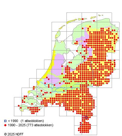 Het aantal atlasblokken (5x5 km) waarin de soort is gemeld binnen een periode van vijf jaar (vanaf 1980) of twintig jaar. Niet gecorrigeerd voor waarnemersinspanning en het aantal doorgegeven waarnemingen kan sterk variëren per periode, dus een trend in verspreiding kan hier niet direct uit worden afgelezen. Het opgegeven jaartal is het eerste jaar van de periode. Bron: gevalideerde waarnemingen uit de NDFF.