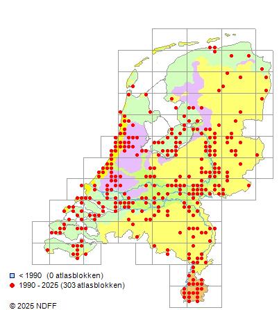 Het aantal atlasblokken (5x5 km) waarin de soort is gemeld binnen een periode van vijf jaar (vanaf 1980) of twintig jaar. Niet gecorrigeerd voor waarnemersinspanning en het aantal doorgegeven waarnemingen kan sterk variëren per periode, dus een trend in verspreiding kan hier niet direct uit worden afgelezen. Het opgegeven jaartal is het eerste jaar van de periode. Bron: gevalideerde waarnemingen uit de NDFF.