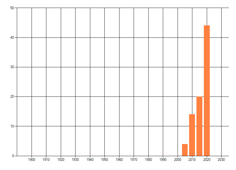 Het aantal atlasblokken (5x5 km) waarin de soort is gemeld binnen een periode van vijf jaar (vanaf 1980) of twintig jaar. Niet gecorrigeerd voor waarnemersinspanning en het aantal doorgegeven waarnemingen kan sterk variëren per periode, dus een trend in verspreiding kan hier niet direct uit worden afgelezen. Het opgegeven jaartal is het eerste jaar van de periode. Bron: gevalideerde waarnemingen uit de NDFF.