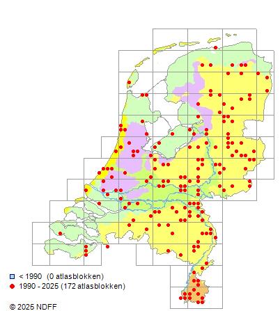 Het aantal atlasblokken (5x5 km) waarin de soort is gemeld binnen een periode van vijf jaar (vanaf 1980) of twintig jaar. Niet gecorrigeerd voor waarnemersinspanning en het aantal doorgegeven waarnemingen kan sterk variëren per periode, dus een trend in verspreiding kan hier niet direct uit worden afgelezen. Het opgegeven jaartal is het eerste jaar van de periode. Bron: gevalideerde waarnemingen uit de NDFF.
