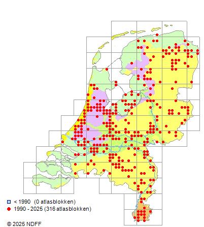 Het aantal atlasblokken (5x5 km) waarin de soort is gemeld binnen een periode van vijf jaar (vanaf 1980) of twintig jaar. Niet gecorrigeerd voor waarnemersinspanning en het aantal doorgegeven waarnemingen kan sterk variëren per periode, dus een trend in verspreiding kan hier niet direct uit worden afgelezen. Het opgegeven jaartal is het eerste jaar van de periode. Bron: gevalideerde waarnemingen uit de NDFF.