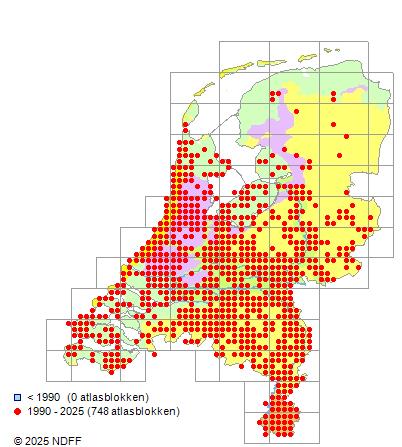 Het aantal atlasblokken (5x5 km) waarin de soort is gemeld binnen een periode van vijf jaar (vanaf 1980) of twintig jaar. Niet gecorrigeerd voor waarnemersinspanning en het aantal doorgegeven waarnemingen kan sterk variëren per periode, dus een trend in verspreiding kan hier niet direct uit worden afgelezen. Het opgegeven jaartal is het eerste jaar van de periode. Bron: gevalideerde waarnemingen uit de NDFF.