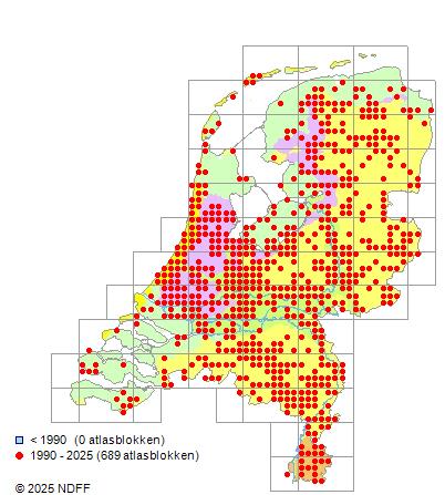 Het aantal atlasblokken (5x5 km) waarin de soort is gemeld binnen een periode van vijf jaar (vanaf 1980) of twintig jaar. Niet gecorrigeerd voor waarnemersinspanning en het aantal doorgegeven waarnemingen kan sterk variëren per periode, dus een trend in verspreiding kan hier niet direct uit worden afgelezen. Het opgegeven jaartal is het eerste jaar van de periode. Bron: gevalideerde waarnemingen uit de NDFF.