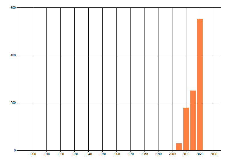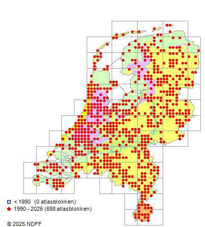 Het aantal atlasblokken (5x5 km) waarin de soort is gemeld binnen een periode van vijf jaar (vanaf 1980) of twintig jaar. Niet gecorrigeerd voor waarnemersinspanning en het aantal doorgegeven waarnemingen kan sterk variëren per periode, dus een trend in verspreiding kan hier niet direct uit worden afgelezen. Het opgegeven jaartal is het eerste jaar van de periode. Bron: gevalideerde waarnemingen uit de NDFF.