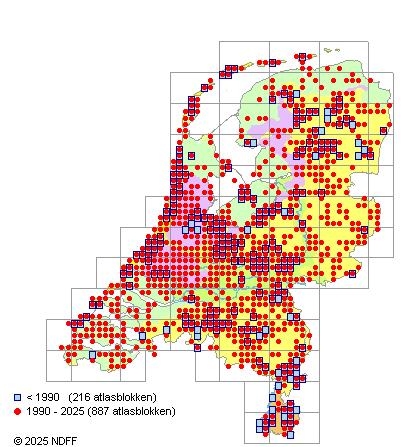 Het aantal atlasblokken (5x5 km) waarin de soort is gemeld binnen een periode van vijf jaar (vanaf 1980) of twintig jaar. Niet gecorrigeerd voor waarnemersinspanning en het aantal doorgegeven waarnemingen kan sterk variëren per periode, dus een trend in verspreiding kan hier niet direct uit worden afgelezen. Het opgegeven jaartal is het eerste jaar van de periode. Bron: gevalideerde waarnemingen uit de NDFF.