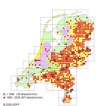 Het aantal atlasblokken (5x5 km) waarin de soort is gemeld binnen een periode van vijf jaar (vanaf 1980) of twintig jaar. Niet gecorrigeerd voor waarnemersinspanning en het aantal doorgegeven waarnemingen kan sterk variëren per periode, dus een trend in verspreiding kan hier niet direct uit worden afgelezen. Het opgegeven jaartal is het eerste jaar van de periode. Bron: gevalideerde waarnemingen uit de NDFF.