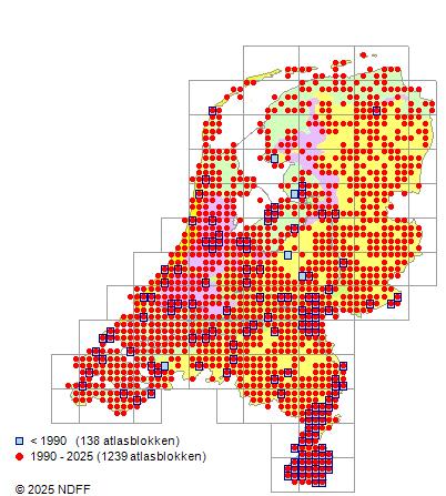 Het aantal atlasblokken (5x5 km) waarin de soort is gemeld binnen een periode van vijf jaar (vanaf 1980) of twintig jaar. Niet gecorrigeerd voor waarnemersinspanning en het aantal doorgegeven waarnemingen kan sterk variëren per periode, dus een trend in verspreiding kan hier niet direct uit worden afgelezen. Het opgegeven jaartal is het eerste jaar van de periode. Bron: gevalideerde waarnemingen uit de NDFF.