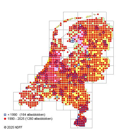 Het aantal atlasblokken (5x5 km) waarin de soort is gemeld binnen een periode van vijf jaar (vanaf 1980) of twintig jaar. Niet gecorrigeerd voor waarnemersinspanning en het aantal doorgegeven waarnemingen kan sterk variëren per periode, dus een trend in verspreiding kan hier niet direct uit worden afgelezen. Het opgegeven jaartal is het eerste jaar van de periode. Bron: gevalideerde waarnemingen uit de NDFF.