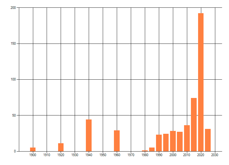 Het aantal atlasblokken (5x5 km) waarin de soort is gemeld binnen een periode van vijf jaar (vanaf 1980) of twintig jaar. Niet gecorrigeerd voor waarnemersinspanning en het aantal doorgegeven waarnemingen kan sterk variëren per periode, dus een trend in verspreiding kan hier niet direct uit worden afgelezen. Het opgegeven jaartal is het eerste jaar van de periode. Bron: gevalideerde waarnemingen uit de NDFF.
