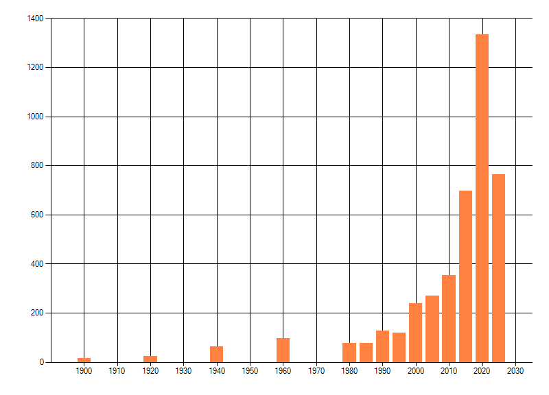 Het aantal atlasblokken (5x5 km) waarin de soort is gemeld binnen een periode van vijf jaar (vanaf 1980) of twintig jaar. Niet gecorrigeerd voor waarnemersinspanning en het aantal doorgegeven waarnemingen kan sterk variëren per periode, dus een trend in verspreiding kan hier niet direct uit worden afgelezen. Het opgegeven jaartal is het eerste jaar van de periode. Bron: gevalideerde waarnemingen uit de NDFF.
