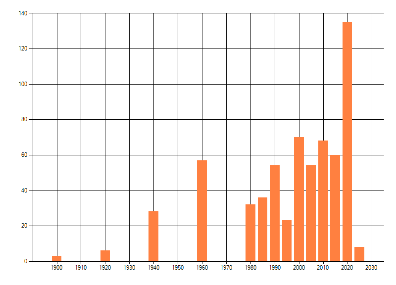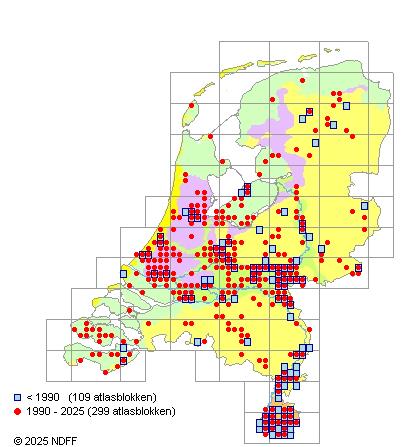 Het aantal atlasblokken (5x5 km) waarin de soort is gemeld binnen een periode van vijf jaar (vanaf 1980) of twintig jaar. Niet gecorrigeerd voor waarnemersinspanning en het aantal doorgegeven waarnemingen kan sterk variëren per periode, dus een trend in verspreiding kan hier niet direct uit worden afgelezen. Het opgegeven jaartal is het eerste jaar van de periode. Bron: gevalideerde waarnemingen uit de NDFF.