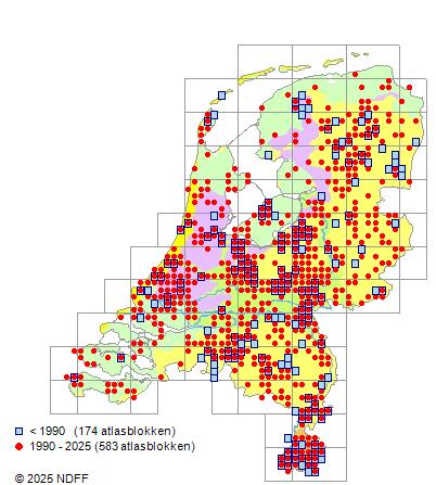Het aantal atlasblokken (5x5 km) waarin de soort is gemeld binnen een periode van vijf jaar (vanaf 1980) of twintig jaar. Niet gecorrigeerd voor waarnemersinspanning en het aantal doorgegeven waarnemingen kan sterk variëren per periode, dus een trend in verspreiding kan hier niet direct uit worden afgelezen. Het opgegeven jaartal is het eerste jaar van de periode. Bron: gevalideerde waarnemingen uit de NDFF.
