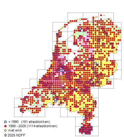 Het aantal atlasblokken (5x5 km) waarin de soort is gemeld binnen een periode van vijf jaar (vanaf 1980) of twintig jaar. Niet gecorrigeerd voor waarnemersinspanning en het aantal doorgegeven waarnemingen kan sterk variëren per periode, dus een trend in verspreiding kan hier niet direct uit worden afgelezen. Het opgegeven jaartal is het eerste jaar van de periode. Bron: gevalideerde waarnemingen uit de NDFF.