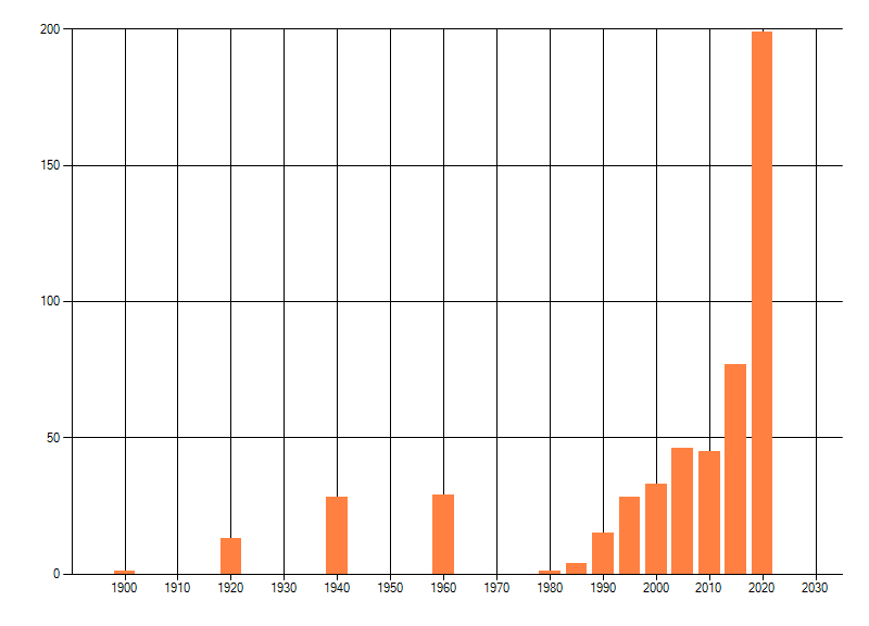 Het aantal atlasblokken (5x5 km) waarin de soort is gemeld binnen een periode van vijf jaar (vanaf 1980) of twintig jaar. Niet gecorrigeerd voor waarnemersinspanning en het aantal doorgegeven waarnemingen kan sterk variëren per periode, dus een trend in verspreiding kan hier niet direct uit worden afgelezen. Het opgegeven jaartal is het eerste jaar van de periode. Bron: gevalideerde waarnemingen uit de NDFF.