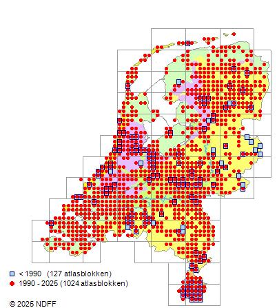 Het aantal atlasblokken (5x5 km) waarin de soort is gemeld binnen een periode van vijf jaar (vanaf 1980) of twintig jaar. Niet gecorrigeerd voor waarnemersinspanning en het aantal doorgegeven waarnemingen kan sterk variëren per periode, dus een trend in verspreiding kan hier niet direct uit worden afgelezen. Het opgegeven jaartal is het eerste jaar van de periode. Bron: gevalideerde waarnemingen uit de NDFF.