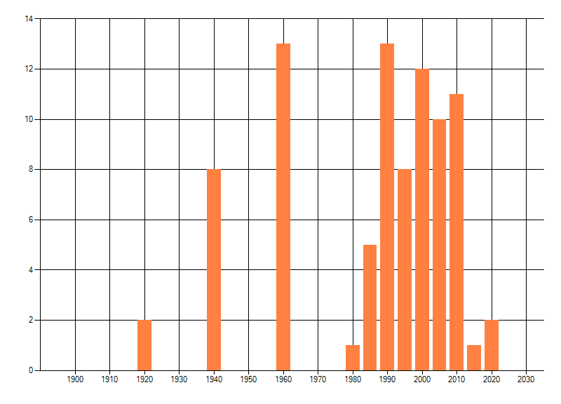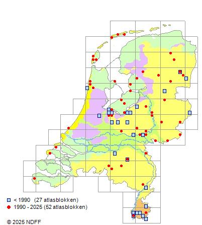 Het aantal atlasblokken (5x5 km) waarin de soort is gemeld binnen een periode van vijf jaar (vanaf 1980) of twintig jaar. Niet gecorrigeerd voor waarnemersinspanning en het aantal doorgegeven waarnemingen kan sterk variëren per periode, dus een trend in verspreiding kan hier niet direct uit worden afgelezen. Het opgegeven jaartal is het eerste jaar van de periode. Bron: gevalideerde waarnemingen uit de NDFF.