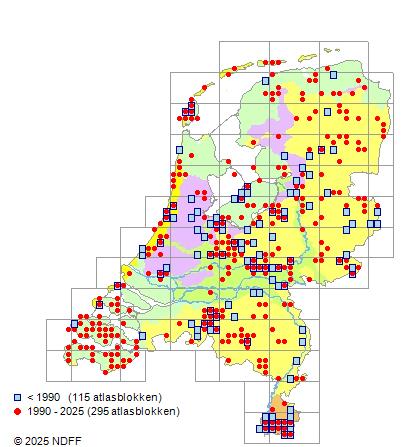 Het aantal atlasblokken (5x5 km) waarin de soort is gemeld binnen een periode van vijf jaar (vanaf 1980) of twintig jaar. Niet gecorrigeerd voor waarnemersinspanning en het aantal doorgegeven waarnemingen kan sterk variëren per periode, dus een trend in verspreiding kan hier niet direct uit worden afgelezen. Het opgegeven jaartal is het eerste jaar van de periode. Bron: gevalideerde waarnemingen uit de NDFF.
