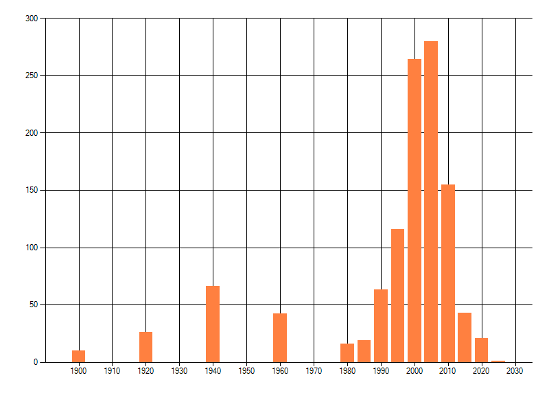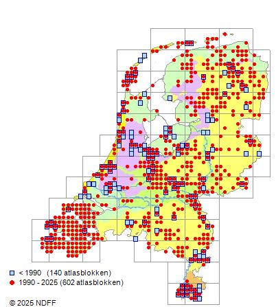 Het aantal atlasblokken (5x5 km) waarin de soort is gemeld binnen een periode van vijf jaar (vanaf 1980) of twintig jaar. Niet gecorrigeerd voor waarnemersinspanning en het aantal doorgegeven waarnemingen kan sterk variëren per periode, dus een trend in verspreiding kan hier niet direct uit worden afgelezen. Het opgegeven jaartal is het eerste jaar van de periode. Bron: gevalideerde waarnemingen uit de NDFF.