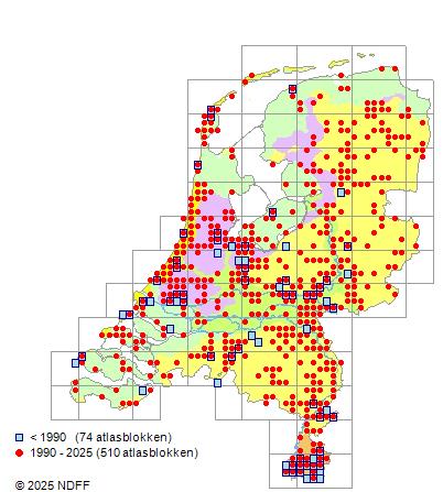 Het aantal atlasblokken (5x5 km) waarin de soort is gemeld binnen een periode van vijf jaar (vanaf 1980) of twintig jaar. Niet gecorrigeerd voor waarnemersinspanning en het aantal doorgegeven waarnemingen kan sterk variëren per periode, dus een trend in verspreiding kan hier niet direct uit worden afgelezen. Het opgegeven jaartal is het eerste jaar van de periode. Bron: gevalideerde waarnemingen uit de NDFF.