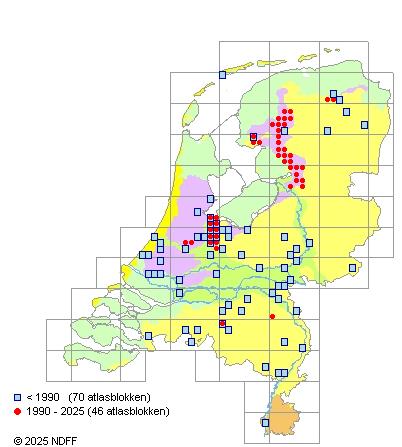 Het aantal atlasblokken (5x5 km) waarin de soort is gemeld binnen een periode van vijf jaar (vanaf 1980) of twintig jaar. Niet gecorrigeerd voor waarnemersinspanning en het aantal doorgegeven waarnemingen kan sterk variëren per periode, dus een trend in verspreiding kan hier niet direct uit worden afgelezen. Het opgegeven jaartal is het eerste jaar van de periode. Bron: gevalideerde waarnemingen uit de NDFF.