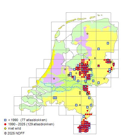 Het aantal atlasblokken (5x5 km) waarin de soort is gemeld binnen een periode van vijf jaar (vanaf 1980) of twintig jaar. Niet gecorrigeerd voor waarnemersinspanning en het aantal doorgegeven waarnemingen kan sterk variëren per periode, dus een trend in verspreiding kan hier niet direct uit worden afgelezen. Het opgegeven jaartal is het eerste jaar van de periode. Bron: gevalideerde waarnemingen uit de NDFF.